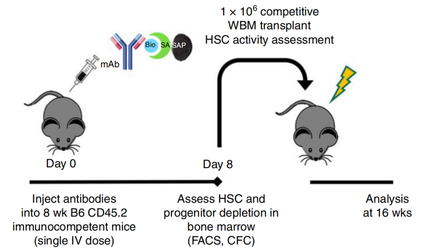 ZAP生物素化内化试剂盒可基于生物素*亲合素结合放大系统的原理,允许我们使用已经生物素化的靶向物(如一抗)来自制靶向毒素,靶向消除动物体内或体外感兴趣的细胞。 造血干细胞移植(HSCT)的治疗效果容易受宿主体内造血干细胞(HSC)影响,导致多种并发症。这项研究使用带有生物素基团的CD117与CD45抗体分别和ZAP生物素化内化试剂盒反应制作抗体偶联结合物——CD117-ADC与CD45-ADC,再通过静脉注射的方式输入小鼠体内(见下图),用于探究淋巴细胞耗竭对HSCT效果的影响。研究结果发现CD117-ADC可以在保持免疫力的提前下,以最小的毒性有效且特异性地消除小鼠体内的HSC,从而有利于安全高效地进行全骨髓(WBM)或纯化HSC的移植。 ZAP抗体内化试剂盒(适用于体外实验) ZAP生物素化内化试剂盒(适用于体外实验 / 体内实验) Advanced Targeting Systems(ATS)是一家位于美国的生物技术公司,致力于为科学研究和药物开发提供高质量的靶向试剂,ATS也是率先将靶向结合物用于“分子外科手术”技术的公司,其产品作为跨领域研究工具,在免疫学、神经科学研究领域有广泛的应用前景。 特色产品包括: Saporin Targeted Toxins(靶向毒素) Secondary Conjugates(二级偶连毒素)ZAP 产品 ZAP抗体内化试剂盒 ZAP生物素化内化试剂盒 巨头的世界总是偏执于大和全, 但无碍于ATS多年来在靶向毒素上的潜心投入。 少即是多,因小而美。 这里是专注精品试剂的四正柏生物, 想要了解更多ATS的产品, 敬请与我们联系。 .png)